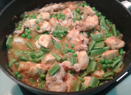 - Añadir la cucharada de pimentón dulce, las judías y los guisantes. Remover para que todos los ingredientes vayan cogiendo el gusto del sofrito