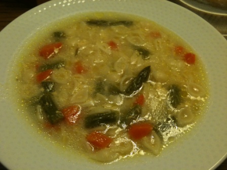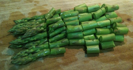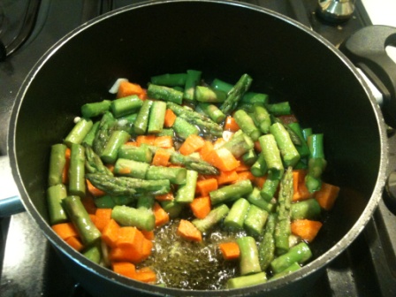- Añadir los espárragos y la zanahoria y rehogar durante 5 minutos removiendo de vez en cuando