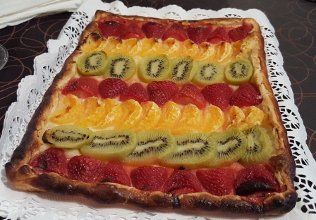 - Colocar una columna de fresones, una columna de kiwis y una columna de mandarinas hasta cubrir toda la masa.