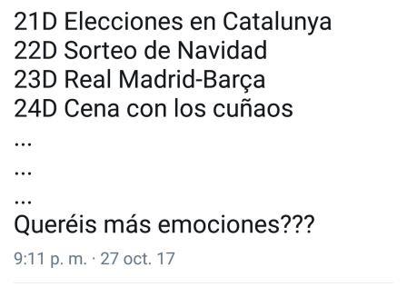 Si bien la atmósfera que se respiraba en Catalunya después del 1 de octubre estaba enrarecida y los ciudadanos no sabían definir cómo se sentían. Si bien la confusión y la estupefacción se han ido apoderando de la ciudadanía a medida que los políticos de uno y otro lado del Ebro iban declarando no se sabe muy bien qué. Si bien el pasado viernes 27 de octubre de 2017 se proclamó la República catalana dejando un reguero de sensaciones y sentimientos desde la alegría absoluta hasta la tristeza pasando por la preocupación. El humor ha sido un elemento que ha acompañado todos estos días, principalmente desde que el barco con las imágenes de Piolín, el Coyote y el Pato Lucas atracó en el puerto de Barcelona hasta el último sobre la montaña rusa de emociones en la que nos subiremos los ciudadanos de Catalunya desde el 21 al 24 de diciembre de 2017.