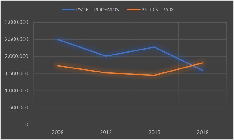 Pero hay que tener en cuenta que estos sufragios no son nuevos. Ya estaban dentro del parlamento andaluz. Porque hay que remarcar que la Derecha solo ha crecido en Andalucía 74.730 sufragios. Ha aumentado un 4% frente al descenso del 36% de la Izquierda, perdiendo 902.575 sufragios. Por tanto, es falsa la afirmación del alcalde socialista de Dos Hermanas en la que sostiene que “No es que nuestro votante se haya quedado en casa, es que ha votado a Ciudadanos y Vox”. Según los datos, no se puede concluir que haya habido un importante trasvase de votos del PSOE a PP o C’s. Andalucía se ha movido muy poco ideológicamente.